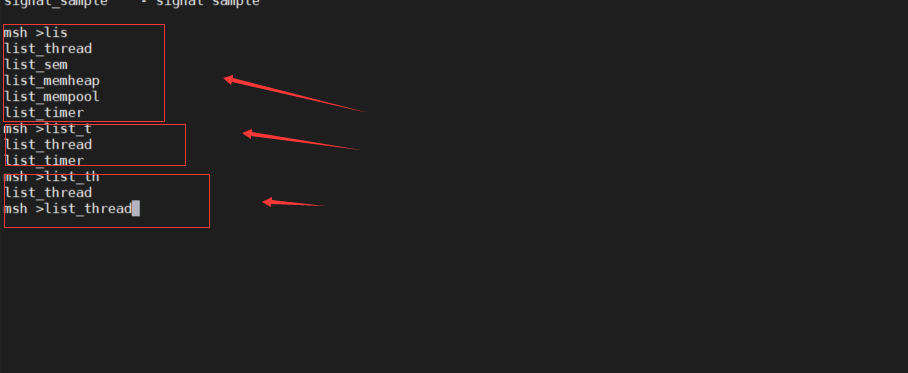 RT-Thread的FinSH组件具有自动补全功能,只需要输入相应的内容后,按下 Tab 键便会自动补全指令或进行提示。