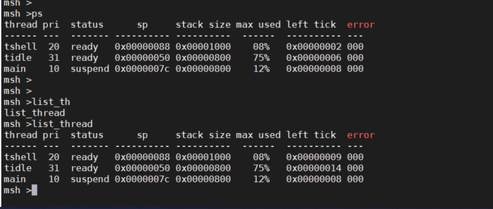 使用 ps 或者 list_thread 命令来列出系统中的所有线程信息,包括线程优先级、状态、栈的最大使用量等。如下图所示: