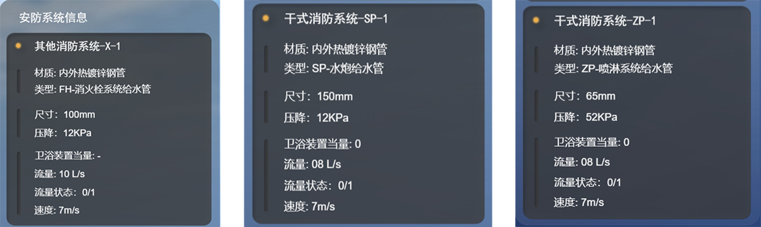2D 面板接入安防系统信息,包括消防系统的材质、水管类型、尺寸、压降、流量和速度等。并在三维场景内以图标形式显示 X-1、SP-1 与 ZP-1 具体位置。为指挥人员提供智能化的预案调用、资源调配,实现对应急事件处置的可视化指挥。