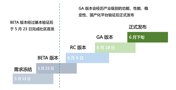 Anolis OS 8.6 经历了需求冻结、BETA 版本、RC 版本、GA 版本及正式发布阶段。在 5 月 23 日完成 BETA 版本的首发后,RC、GA 版本还进行了产业级别的功能、性能、稳定性、国产化平台等验证覆盖。
