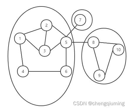 在无向图中,如果从节点 vi 到节点 vj 有路径,则称节点 vi 和节点 vj 是连通的。如果图中任意两个节点都是连通的,则称图为连通图。下图就是一个连通图。