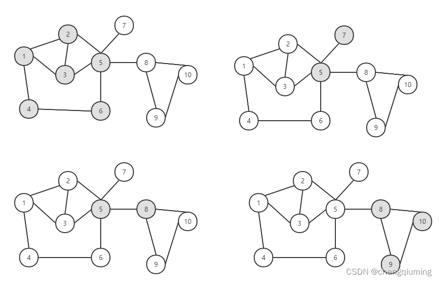 桥是连接河两岸的交通要道,桥断了,则河两岸不再连通。在图中,桥也有同样的含义,如下图所示,去掉 5-8 后,图分裂为两个互不连通的子图,边 5-8 为图 G 的桥,同样,边 5-7 也为图 G 的桥。