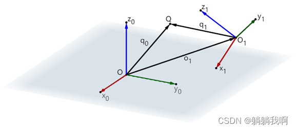 Q 为空间中一点,在不同坐标系下的表示如下图所示