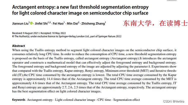 Jianxun Liu ,Jinfei Shi,Fei Hao,Min Dai,Zhisheng Zhang.Arctangent entropy: a new fast threshold segmentation entropy for light colored character image on semiconductor chip surface[J].Pattern Analysis and Applications.2022.https://doi.org/10.1007/s10044-022-01079-y.