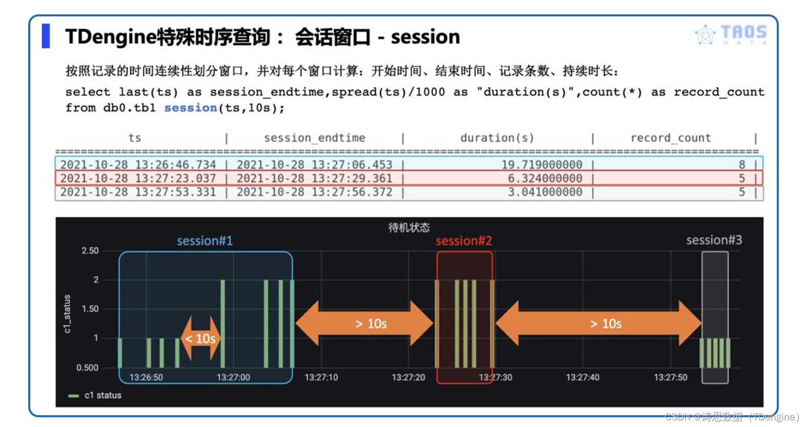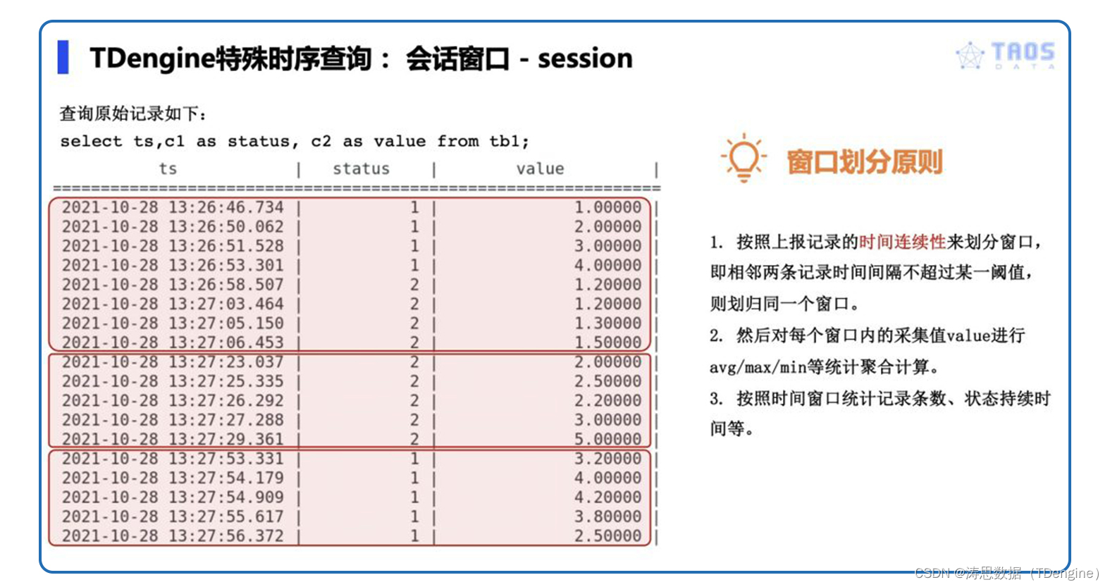 上图中 “status” 列,表征设备的当前工作状态,状态窗口对 “status” 值的连续变化情况进行判断,划分出三个窗口,并可以分别对每个窗口进行聚合,比如计算每个窗口内的开始时间、结束时间、总记录条数、平均值、窗口持续时间等。这些均可在 TDengine 中通过一条 SQL 查询语句直接实现,具体 SQL 语句和查询结果见下图。