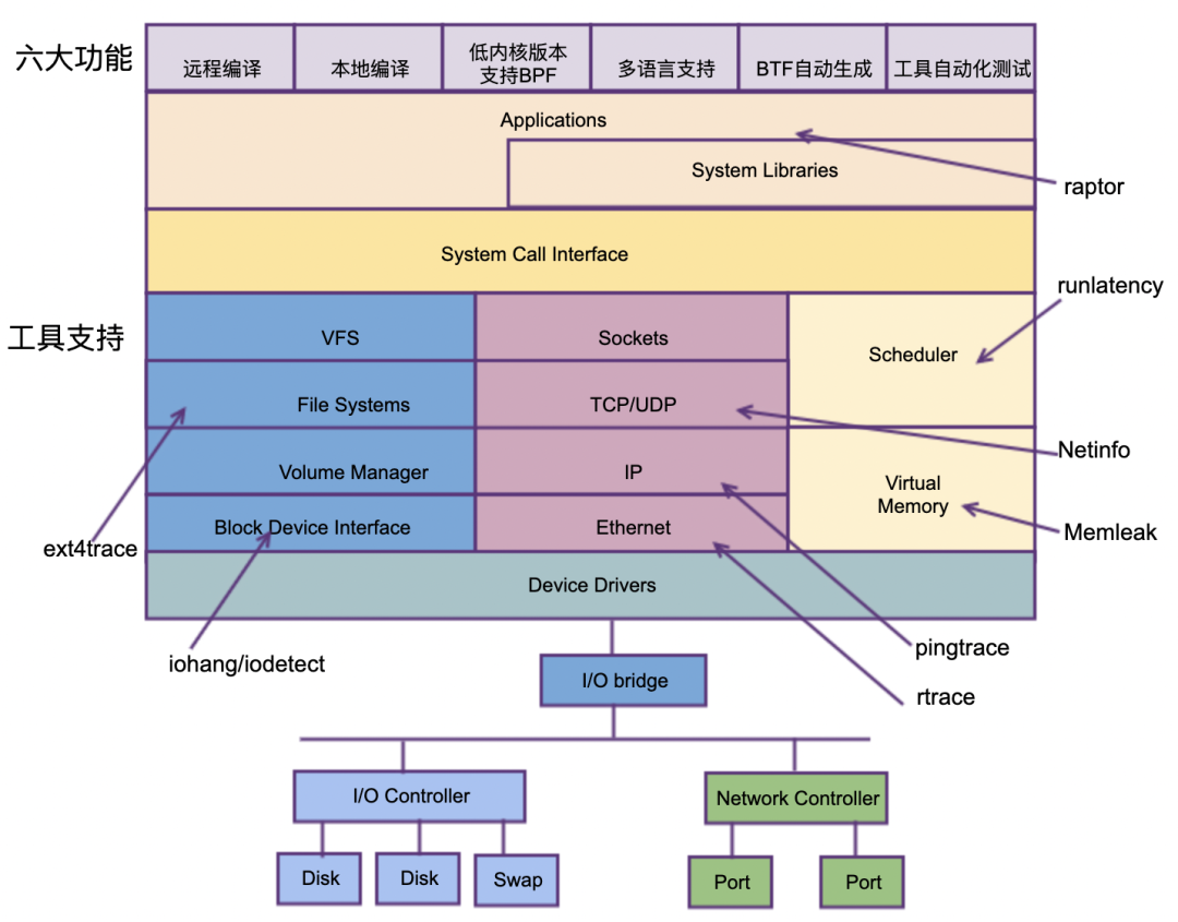 下图为 coolbpf 的功能和工具支持情况,欢迎更多优秀 BPF 工具加入: