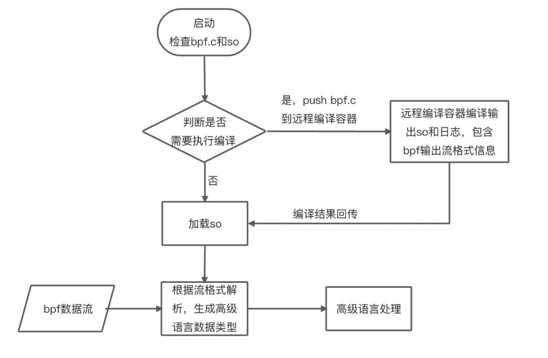 2)远程编译服务:接收 bpf.c,生成 bpf.so 或 bpf.o,提供给高级语言进行加载,用户只专注自己的功能开发,不用关心底层库安装、环境搭建。