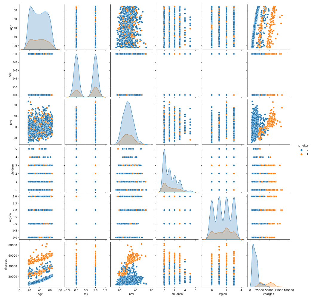 对数据做一些可视化容易得知,bmi 对于 charges 的影响大小,与是否吸烟密切相关。吸烟与否,bmi 对于是否 charges 的影响不同,不吸烟时 charges 整体较小,吸烟时,当 bmi 小于 30 时 charges 较小,当 bmi 大于 30 时 charges 较大。由于该题特征较少数据量也并不大,故考虑将 bmi 与 smoker 融合生成一个新的特征 smoker_bmi。当 smoker 为 0 时,smoker_bmi 也为 0;当 smoker 为 1,bmi 小于 30 时,smoker_bmi 为 1;当 smoker 为 1,bmi 大于 30 时,smoker_bmi 为 2。