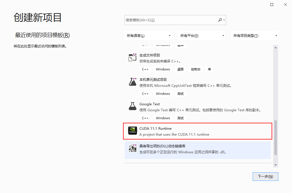 安装完后,打开VS,将添加类似 CUDA 11.1 Runtime 这样的选项