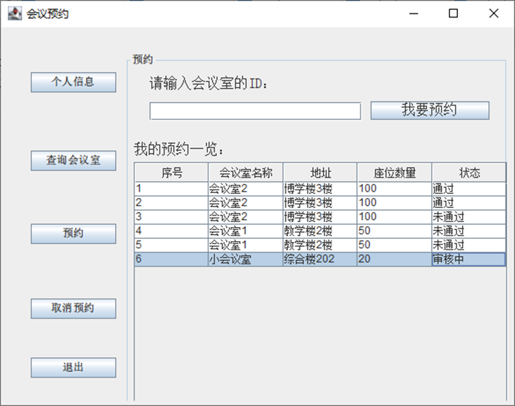 取消预约。通过输入已经预约的会议的ID,可取消预约。