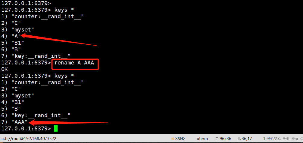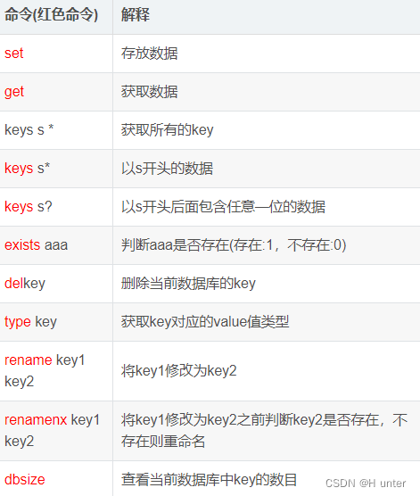 set 、get和del :存放、获取和删除数据 keys:获取key,可以结合通配符 * 和 ? exists和type:判断key是否存在和判断类型 rename和renamenx:重命名的两种,后者会进行判断,存在则不改 dbsize:查看当前数据库中key的数目