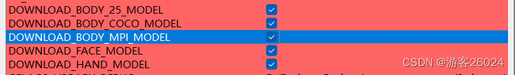 完成之后,再点BUILD_PYTHON,DOWNLOAD_BODY_25_MODEL,DOWNLOAD_BODY_COCO_MODEL,DOWNLOAD_BODY_MPI_MODEL(hand,face也如果有用也选吧!)。