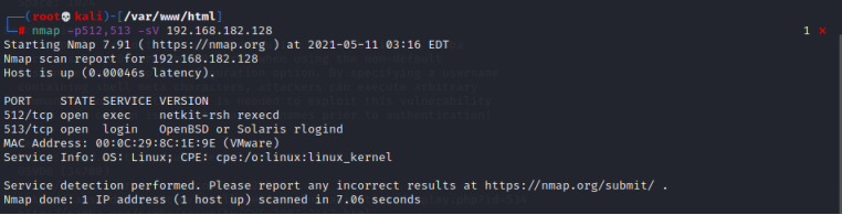 使用nmap -sV -p 512,513 IP地址 探测目标rlogin版本信息。