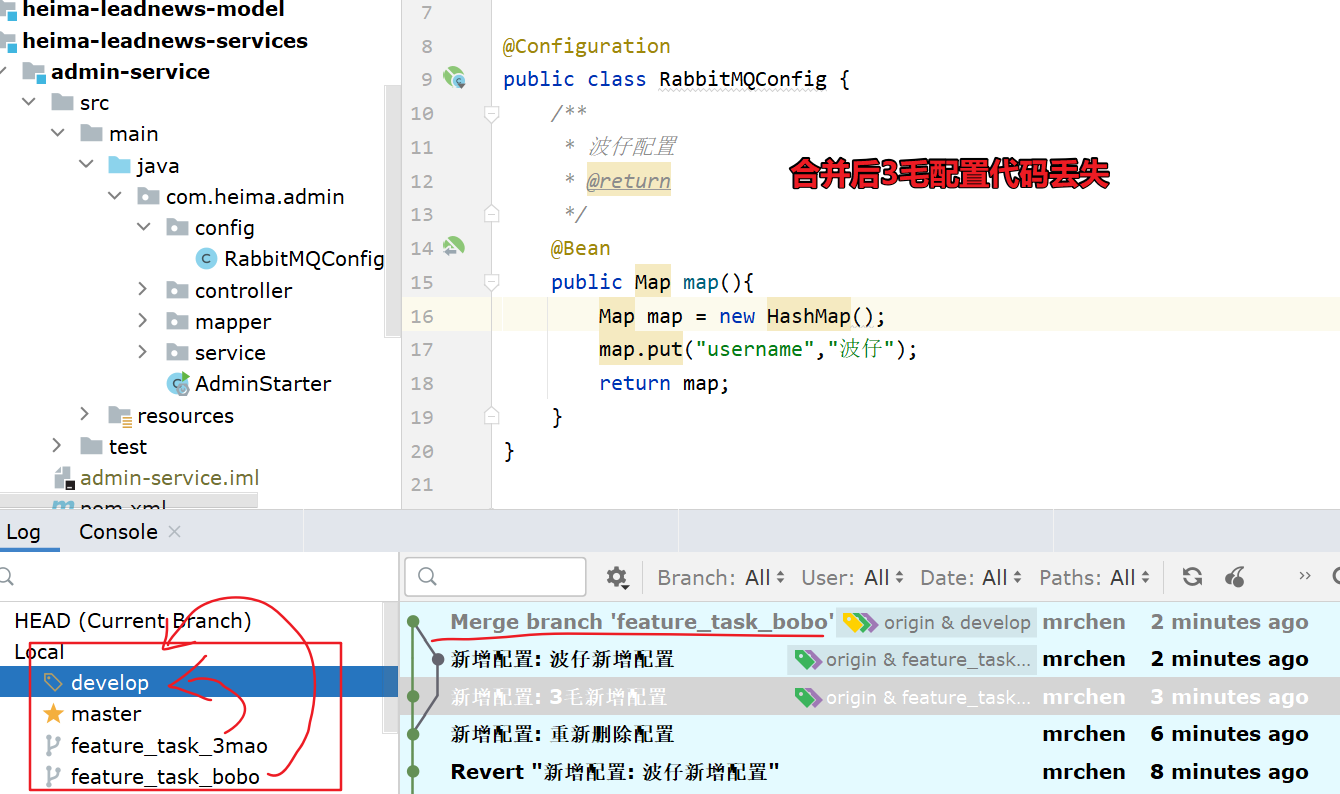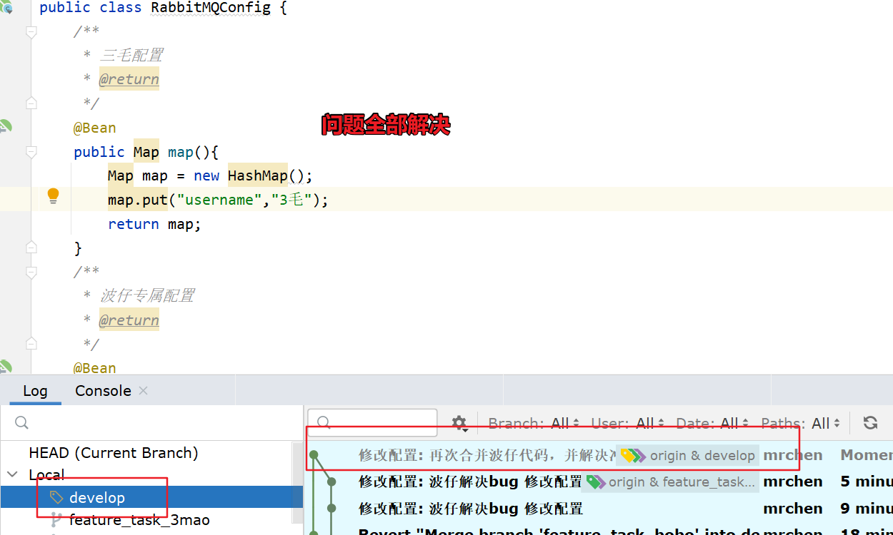 不过暂时,以为是正常的冲突,所以波波选择解决冲突,并commit提交了代码。并且合并冲突时波仔误删了3毛的配置代码。