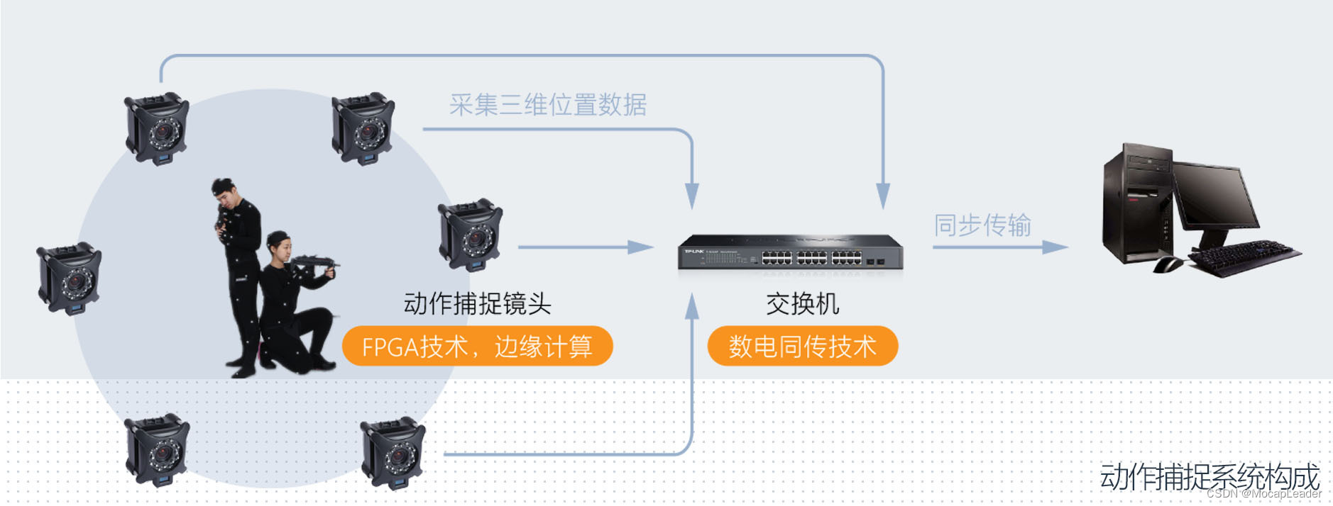 通过布置在场地内的多个光学镜头从不同角度捕捉固定在人体/物体表面的反光标识点的位置信息,捕捉其动作姿态。根据被捕捉物/人不同的特征,还可将光学动捕分成无标记点式光学动作捕捉系统、标记点式光学动作捕捉系统。