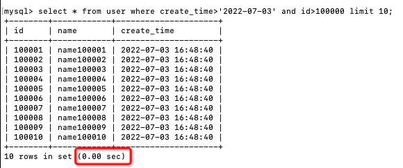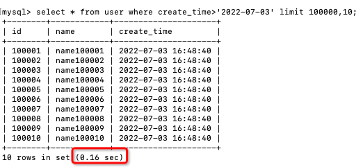 - create_time是非聚簇索引,需要先查询出主键ID,再回表查询,通过主键ID查询出所有字段