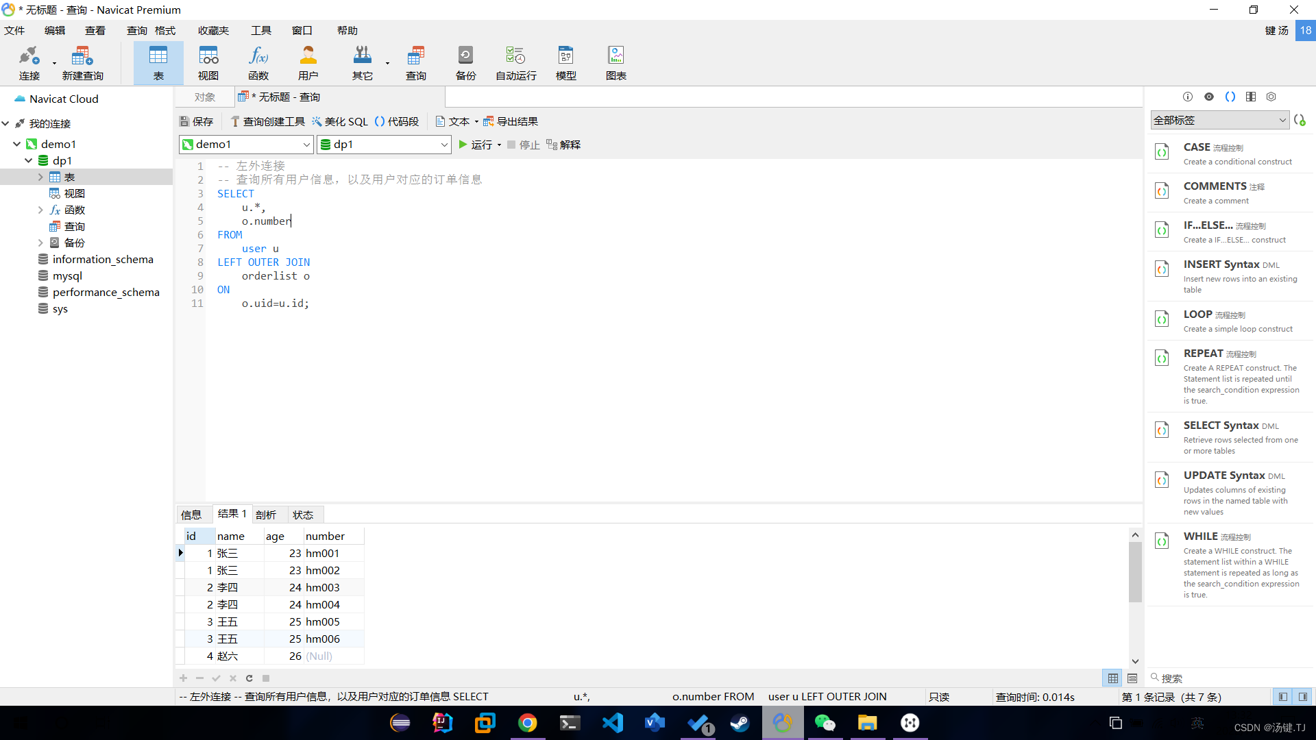 -- 左外连接-- 查询所有用户信息,以及用户对应的订单信息SELECT u.*, o.numberFROM user uLEFT OUTER JOIN orderlist oON o.uid=u.id;