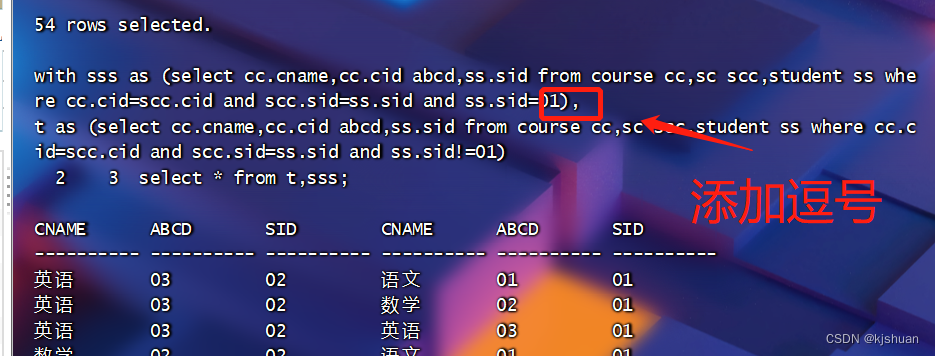 - t as (select cc.cname,cc.cid abcd,ss.sid from course cc,sc scc,student ss where cc.cid=scc.cid and scc.sid=ss.sid and ss.sid!=01)