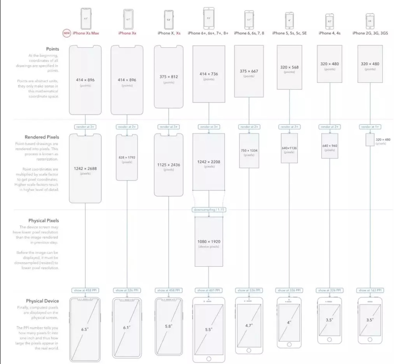 而如果有一把尺子来实际测量这部手机的物理像素,实际为 1242*2688 物理像素;经过计算可知,1242/414=3,也就是说,在单边上,一个逻辑像素=3个物理像素,就说这个屏幕的像素密度为 3,也就是常说的 3 倍屏。