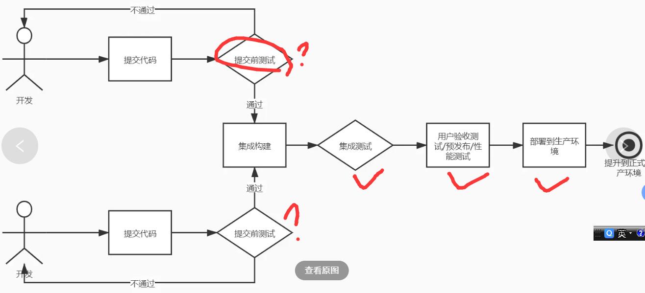 在部署流水线流程中,代码提交前、构建后、预发布环境、生产环境都有测试参与。