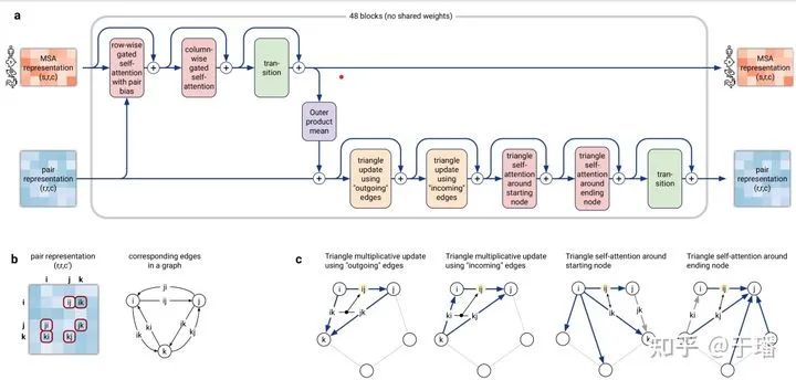 在网络架构中接收前面提取的MSA和pair表征后,不仅有横向的attention对当前氨基酸序列的所谓位置进行attention计算,还有纵向的attention去获取其他MSA序列相同位置上氨基酸的突变与稳定性信息。MSA经过横纵attention之后再经过一个transition层,然后通过计算外积并取平均来计算pairwise features。对于pairwise features的更新采用的是三角法则原理,原因是pairwise features信息记录了残基之间的两两距离关系,因距离关系不是自由的,应该满足三角不等式,即:相邻的三个边应该满足两边之和大于等于第三边,所以对于每个边,即pairwise features里的每个pair信息都会接收和其相关的可组成三角形的任意两个边来进行更新。