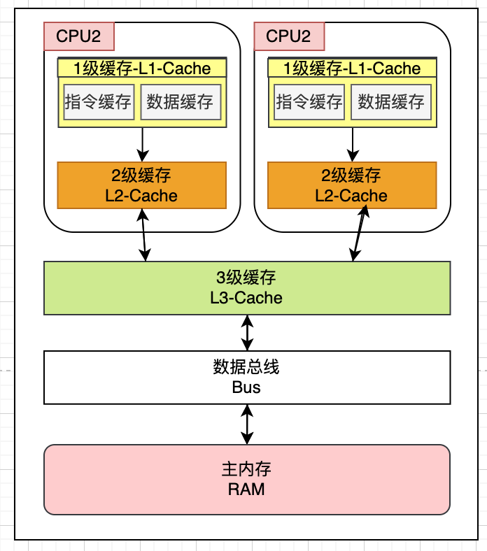 因为CPU的执行速度和内存的读写速度,相差太大。CPU完成操作后,如果要等到内存也执行完成再继续下一个操作的话,对CPU算力就是极大的浪费。所以为了匹配2者的速度差,引入了高速缓存。现在CPU一般都有3级缓存,其中一级缓存离CPU核最近,速度也最快,可分为指令缓存和数据缓存2部分;下面是二级缓存,一个CPU核心就配备一个一级缓存和二级缓存的,是私有的。而三级缓存则是共享的,再下面是数据总线和主内存。