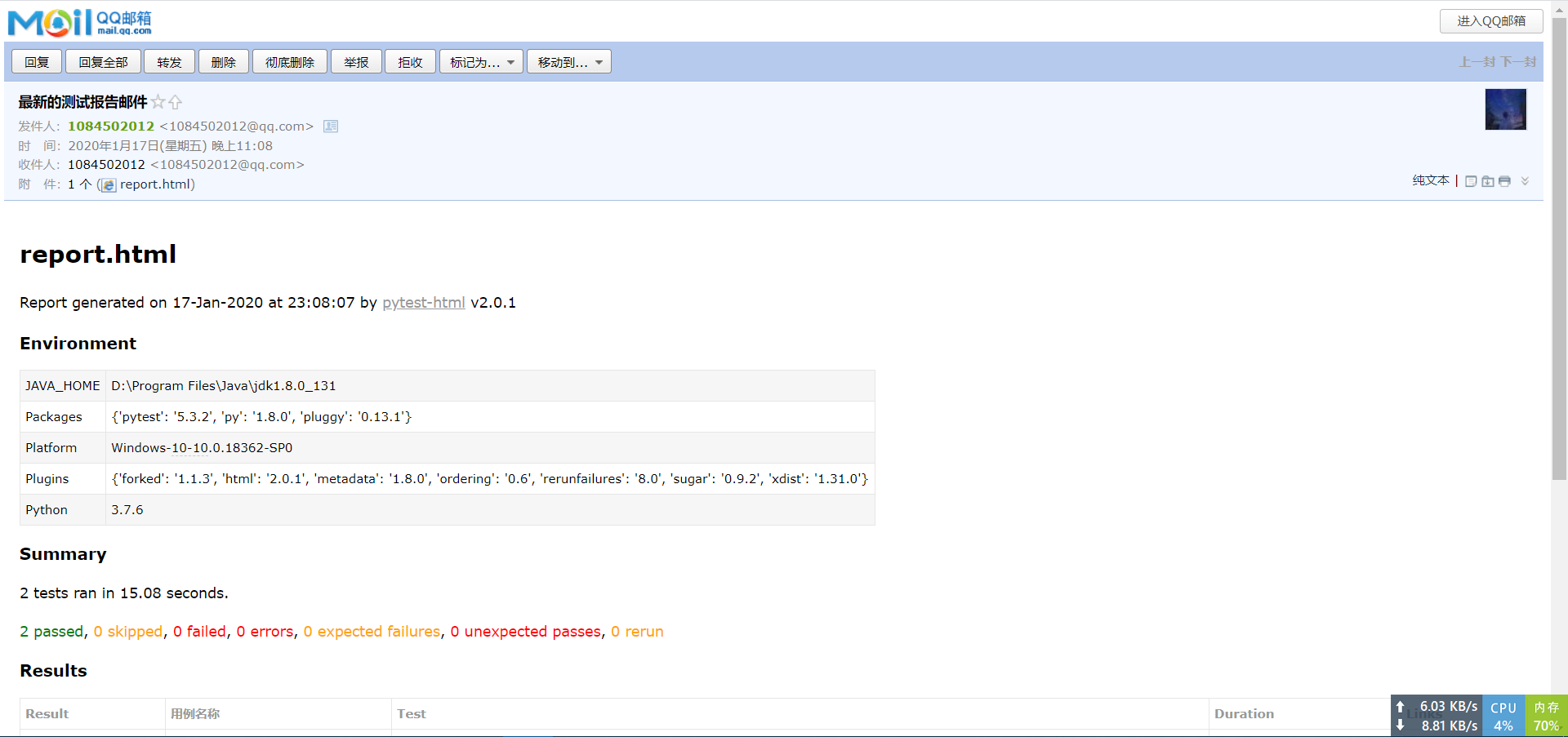 可以看到测试报告邮件已经发送成功了。打开邮箱。