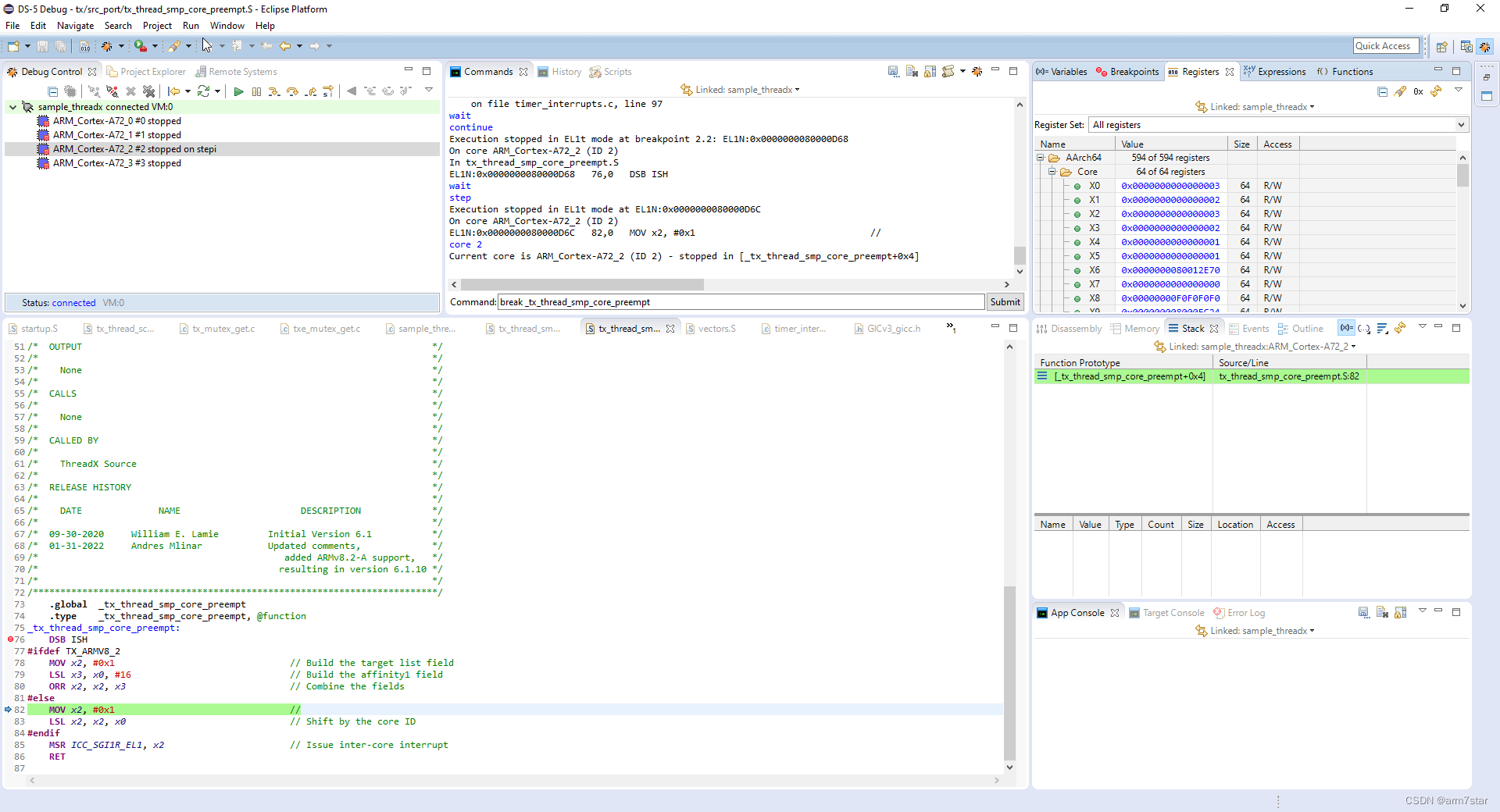 下图所示为从核2发送中断到核3,左上角窗口的"ARM_Cortex-A72_2 #2 stoped on stepi"为当前调试的核,也就是单步执行指令的核,右上角窗口显示的是当前核的寄存器列表,x0也就是_tx_thread_smp_core_preempt的参数0(core),core就是3,也就是要从核2发送中断到核3: