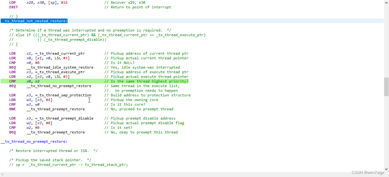 不管是SGI还是普通中断,中断退出时都会检查是否需要重新调度线程,SGI一般都是为了重新调度,普通中断也可能触发重新调度,所以中断退出都要检查一下是否需要重新调度,主要实现如下图,x8是cpu ID(当前是3),x0是核上当前执行的线程,x2是当前核下一个需要调度的线程,也就是上一小结的_tx_thread_execute_ptr[3]、_tx_thread_current_ptr[3],如果不相等就要进行线程切换,需要调度_tx_thread_execute_ptr[3]。