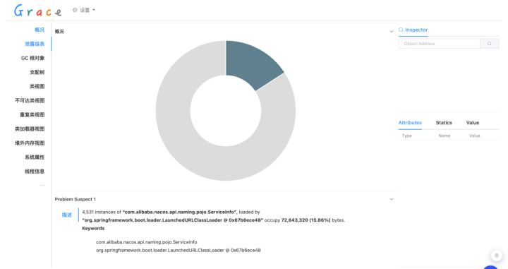 点击查看后,自动跳转至 Grace 分析的页面,我们可以看到内存分析的概况,内存泄露报表、类加载器等等一系列信息。通过详细的内存分析数据查看内存占用的详细信息,从而进一步排查内存泄漏和内存浪费等内存问题。