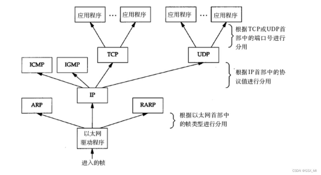 - 数据封装成帧后发到传输介质上,到达目的主机后每层协议再剥掉相应的首部,根据首部中的“上层协议字段”将数据交给对应的上层协议处理。