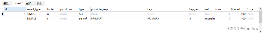 EXPLAIN SELECT * FROM t_user u where u.roleid =(select roleid from t_role where rolename='管理员' )