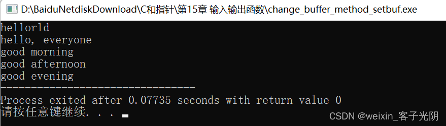 setvbuf函数更为通用。mode参数用于指定缓冲的类型。其中,_IOFBF指定一个完全缓冲的流,_IONBF指定一个不缓冲的流,_IOLBF指定一个行缓冲流。所谓行缓冲流,就是每当一个换行符写入到缓冲区时,缓冲区便进行刷新。