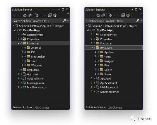 在新的 .NET MAUI 项目中,平台位于一个子文件夹中,将重点放在您花费大部分精力的应用程序上。在项目的“资源”文件夹中,你只需一个位置[18]即可管理应用的字体[19]、图像[20]、应用图标[21]、初始屏幕[22]、原始资源和样式。.NET MAUI 将针对每个平台的独特需求进行优化。