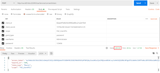 1.从用户管理网站获取密码访问令牌(URL:http//xa-dd3-bks:22345/UserService/connect/token)。