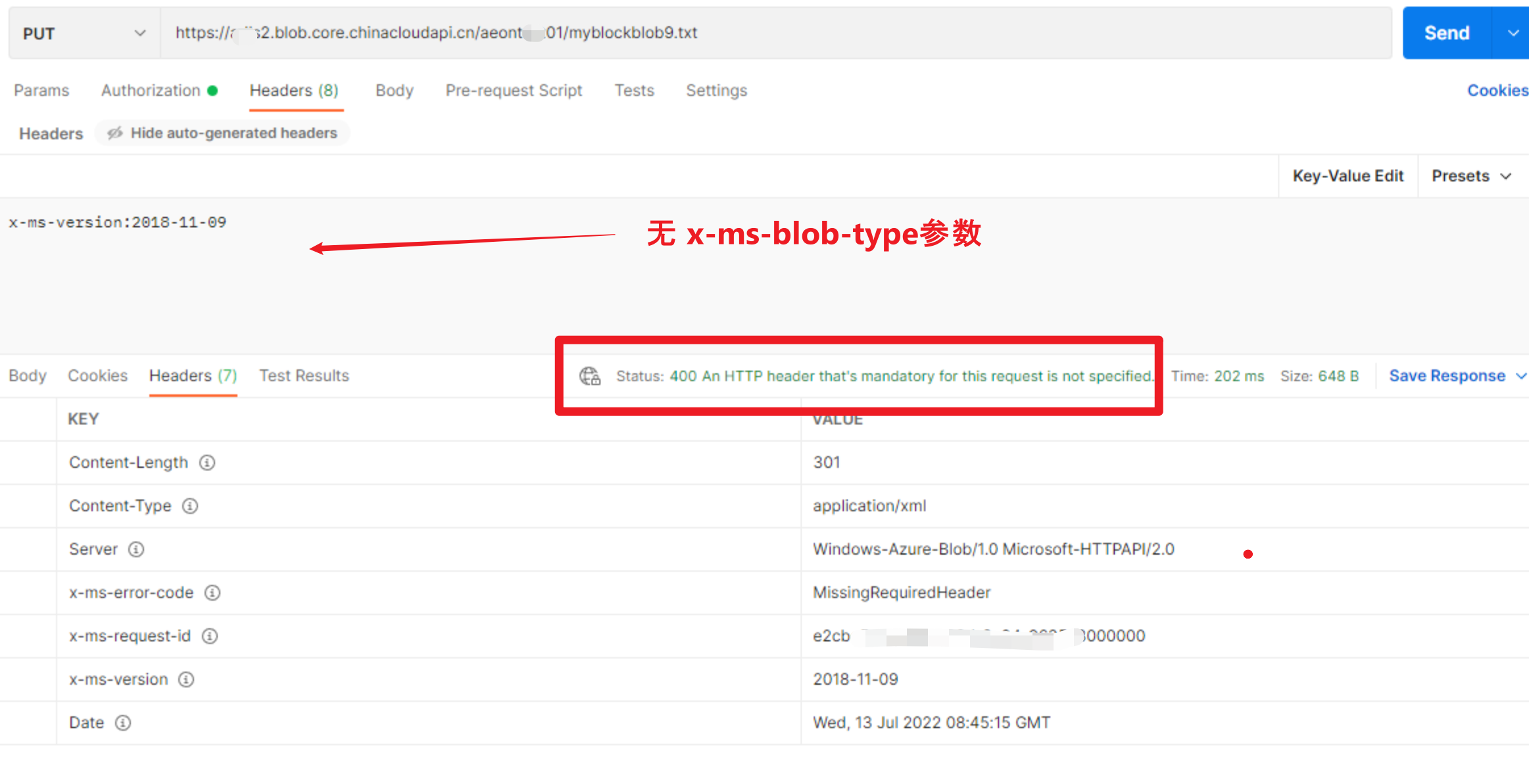 它必须的Header参数有:x-ms-version,x-ms-blob-type,x-ms-lease-id,Authorization,x-ms-date,Content-Length等。但是在Hadoop的日志中,我们只发现了 x-ms-version为 2018-11-09,缺少了x-ms-blob-type。