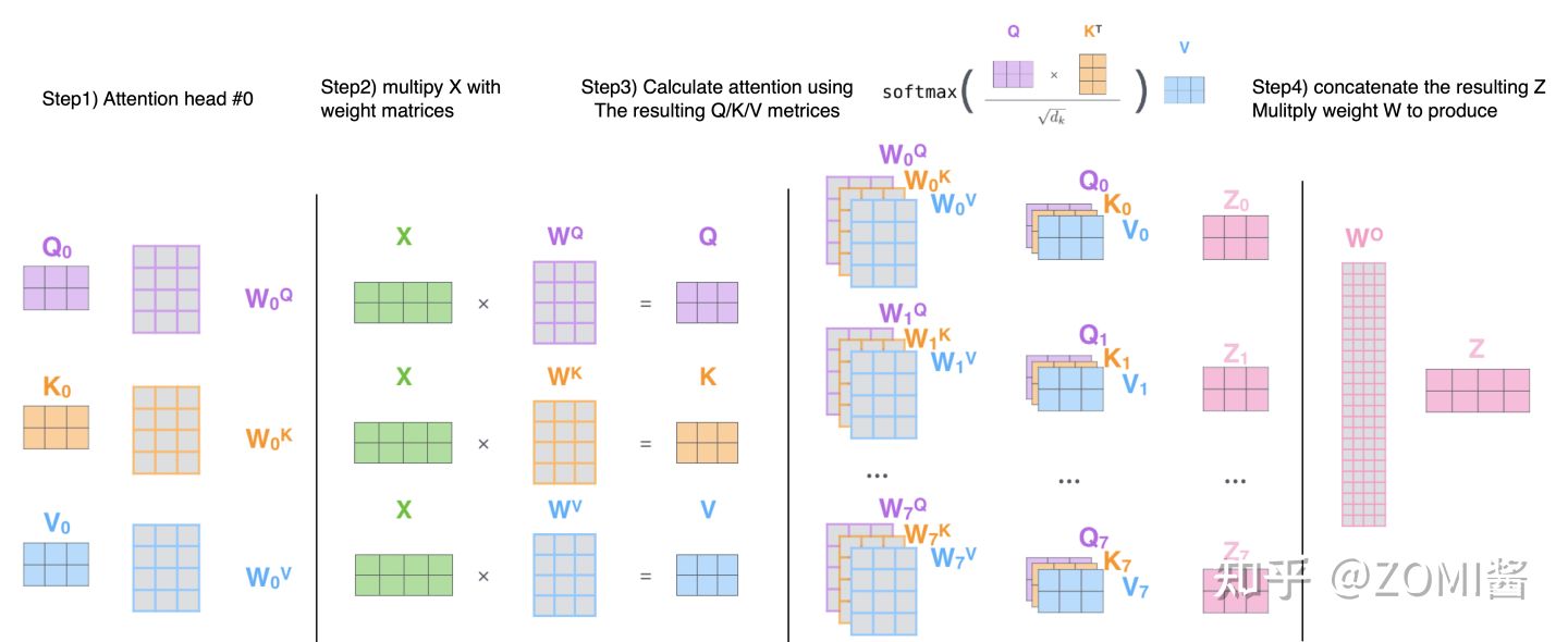 首先有一个 Query 矩阵 Q 和一个 Key 矩阵 K,把二者矩阵乘在一起并进行归一化以后得到 attention 矩阵,它再与Value矩阵 V 相乘得到最终的输出得到 Z。最后经过 linear transformation 得到 NxD 的输出结果。