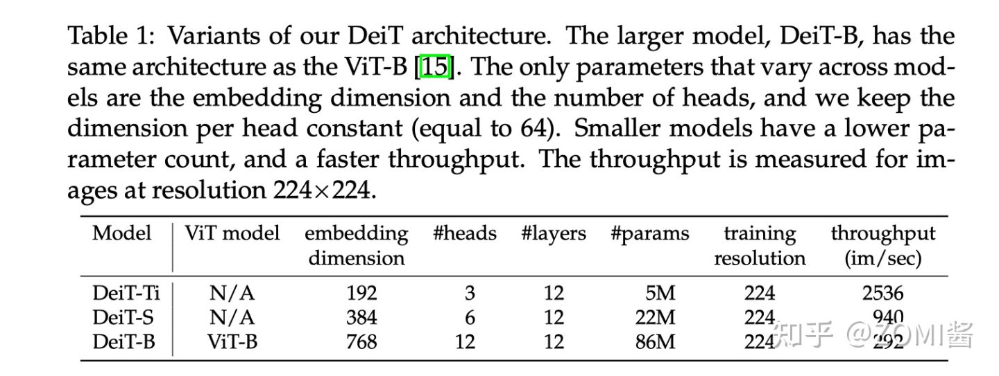 实验参数的设置:图中表示不同大小的 DeiT 结构的超参数设置,最大的结构是 DeiT-B,与 ViT-B 结构是相同,唯一不同的是 embedding 的 hidden dimension 和 head 数量。作者保持了每个head的隐变量维度为64,throughput是一个衡量DeiT模型处理图片速度的变量,代表每秒能够处理图片的数目。