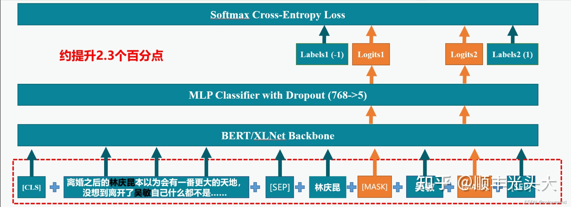 按照上面把content和每个entity拼接起来后,送入bert模型提取句向量,然后过分类器,这样就完成了这个任务,这个方案在比赛中也有人使用据说效果不是很理想。下面来看看比赛第一名的方案: