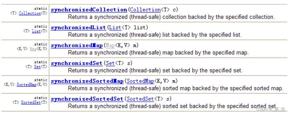 Collections 类中提供了多个synchronizedXxx() 方法,该方法可使将指定集合包装成线程同步的集合,从而可以解决多线程并发访问集合时的线程安全问题