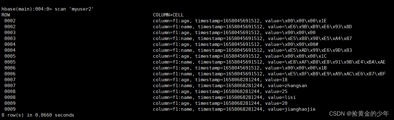 HBase(main):011:0> put 'user', 'rk0001', 'info:name', 'zhangsan'
