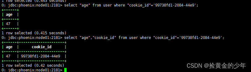 select "cookie_id","age" from user where "cookie_id"='99738fd1-2084-44e9';