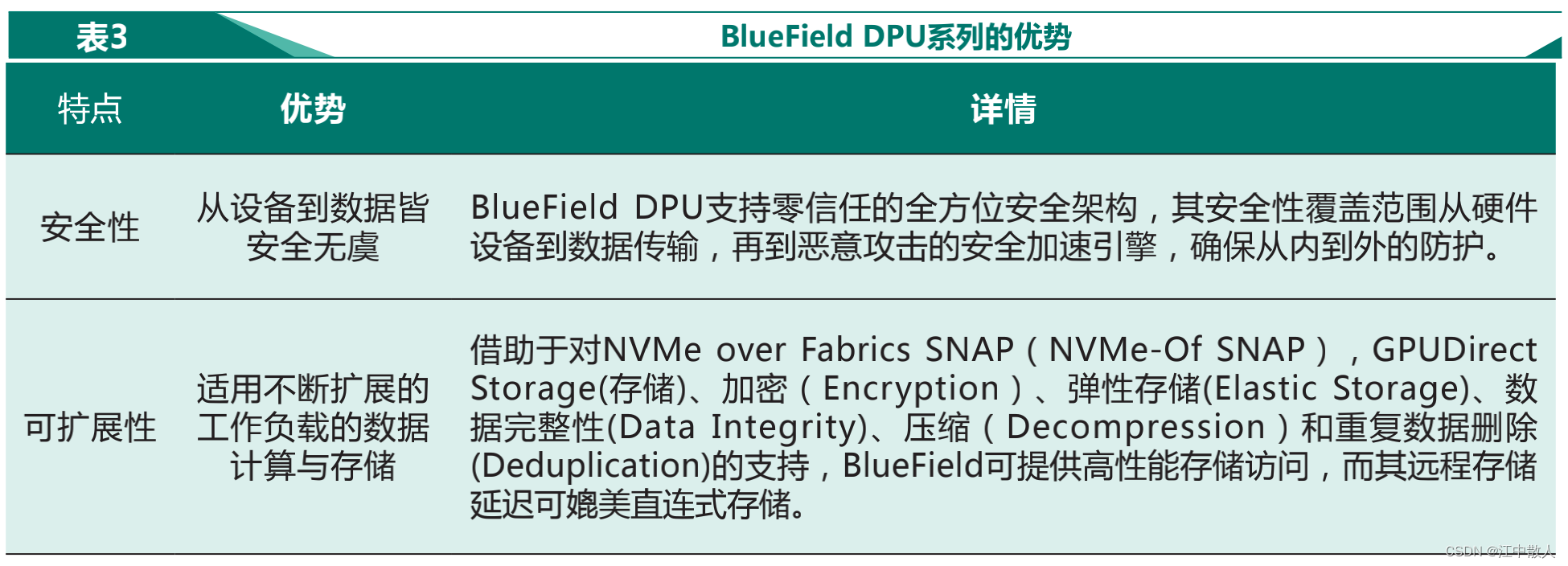 现代超大规模云技术推动数据中心走向了新的架构,利用一种专门针对数据中心基础架构软件而设计的新型处理器,来卸载和加速由虚拟化、网络、存储、安全和其它云原生AI服务产生的巨大计算负荷,这种产品即BlueField DPU系列。NVIDIA 创始人兼首席执行官黄仁勋表示:“现代超大规模云正在推动数据中心的新架构。需要一种旨在处理数据中心基础设施软件的新型处理器来卸载和加速虚拟化、网络、存储、安全和其它云原生AI服务的巨大计算负载。BlueField DPU的时代已经到来。”如表3所示,BlueField DPU系列产品优势有:从外围设备到服务器都具备安全性、适用不断扩展的工作负载的数据存储、高性能且高效的网络、软件定义的基础架构等。