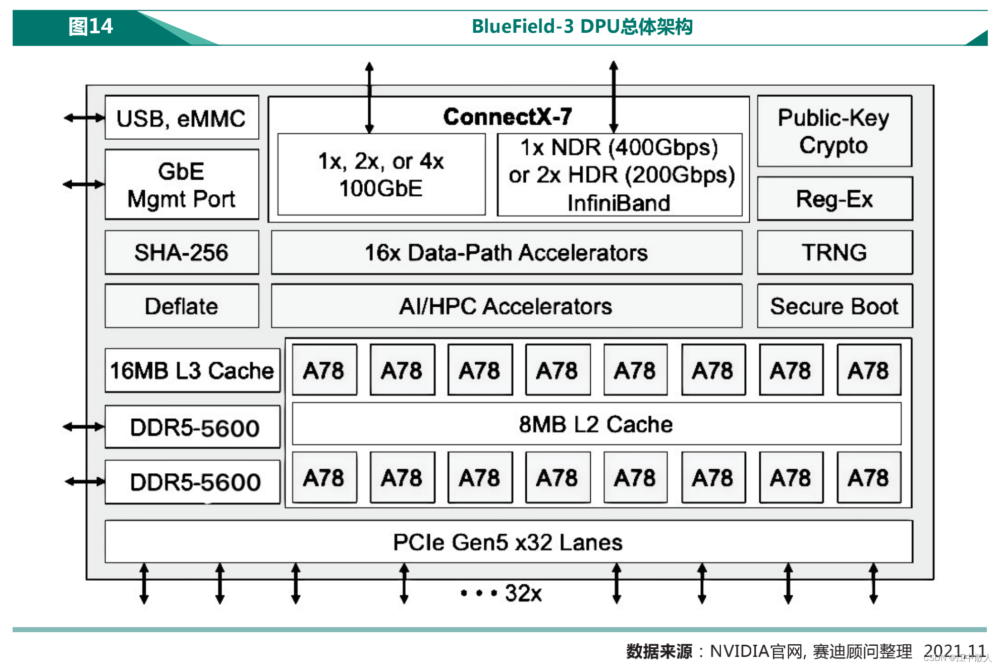 1) BlueField-3 DPU拥有更强大的ARM核计算能力和更快的加解密速度,它与CPU、GPU和内存的互连速度也更快。