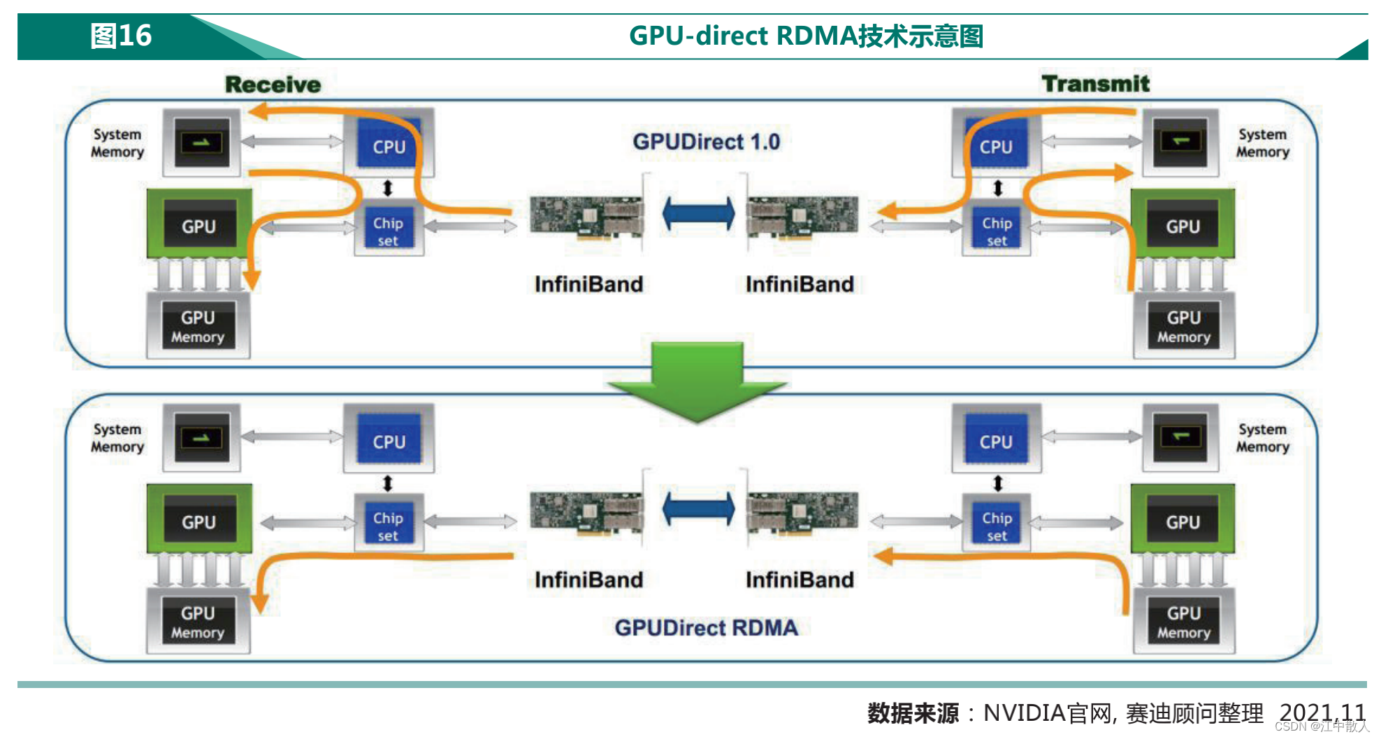 GPU-direct RDMA技术,简称GDR技术,该技术可实现计算机1的GPU可以直接访问计算机2的GPU内存。而在没有这项技术之前,GPU需要先将数据从GPU内存搬移到系统内存,然后再利用RDMA传输到计算机2,计算机2的GPU还要做一次数据从系统内存到GPU内存的搬移动作。GPU-Direct RDMA技术使得进一步减少了GPU通信的数据复制次数,通信延迟进一步降低。Mellanox网卡已经提供了GPUDirect RDMA的支持(既支持InfiniBand传输,也支持RoCE传输),在英伟达收购Mellanox后,英伟达的所有网卡已全面支持GPU-Direct RDMA技术。