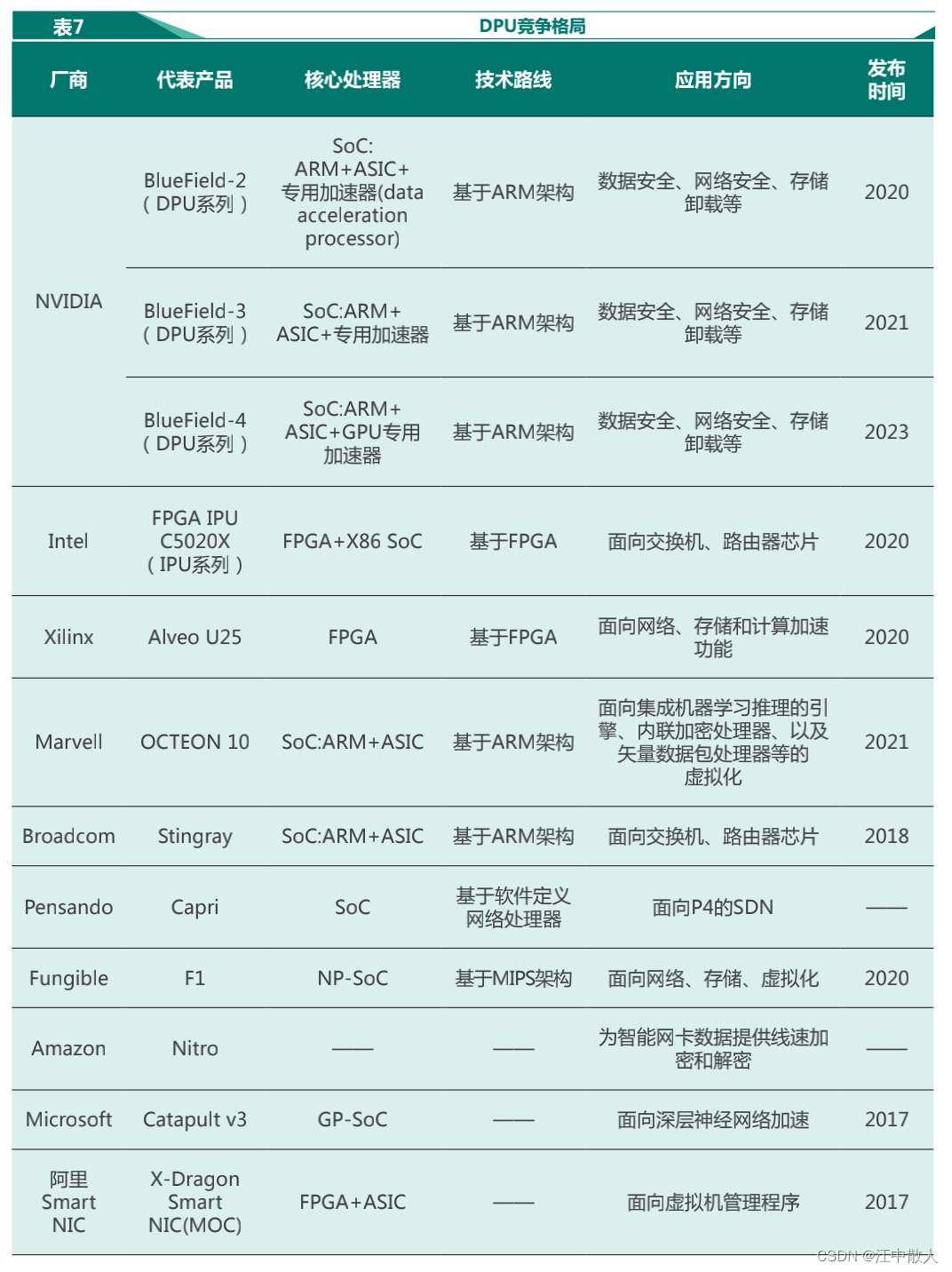 本报告已经以英伟达DPU为例详写了产品结构及技术特点等,此部分不再赘述。