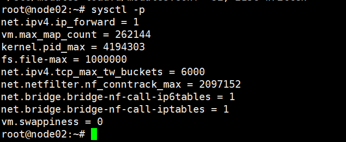 root@master:~# cat /etc/sysctl.conf net.ipv4.ip_forward=1 vm.max_map_count=262144 kernel.pid_max=4194303 fs.file-max=1000000 net.ipv4.tcp_max_tw_buckets=6000 net.netfilter.nf_conntrack_max=2097152 net.bridge.bridge-nf-call-ip6tables = 1 net.bridge.bridge-nf-call-iptables = 1 vm.swappiness=0 root@master:~# sysctl -p