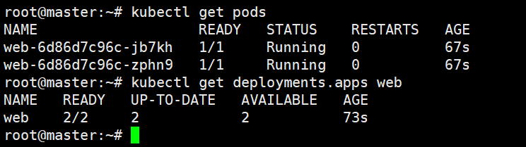 root@master:~# cat web.yaml apiVersion: apps/v1 kind: Deployment metadata: creationTimestamp: null labels: app: web name: web spec: replicas: 2 selector: matchLabels: app: web template: metadata: labels: app: web spec: containers: - image: nginx:latest name: nginx imagePullPolicy: IfNotPresent