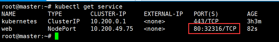 root@master:~# kubectl expose deployment web --target-port 80 --port 80 --type NodePort