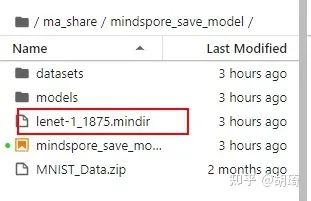 导出完成之后,在当前目录下会生成一个MINDIR格式文件,如下图中名为lenet-1_1875.mindir的文件。